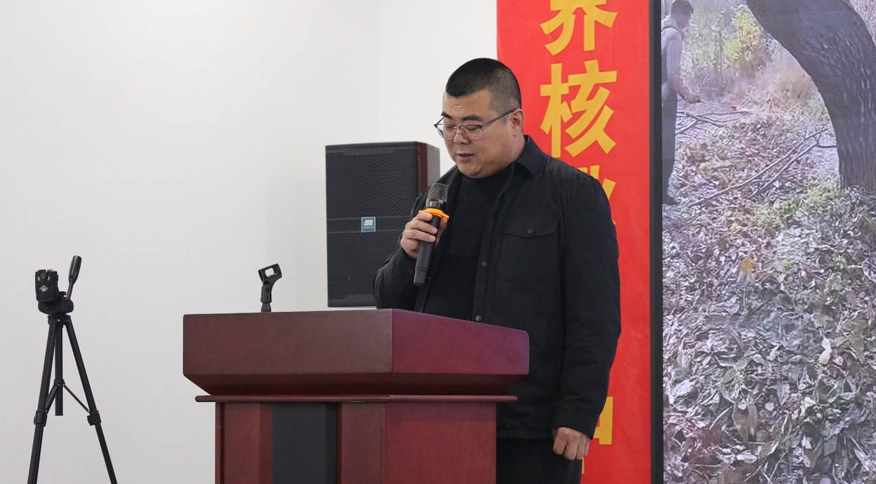 发布会现场,气氛热烈而庄重。随着预热视频的播放,参会嘉宾对“万岁子”新品种的特点、优势及市场前景有了初步了解。随后,涞水县惠农麻核桃协会会长冀卫东同志发表了热情洋溢的欢迎致辞,他详细介绍了协会的发展历程、新品研发的意义以及“万岁子”品种的诸多优势,引发了现场观众的强烈兴趣。